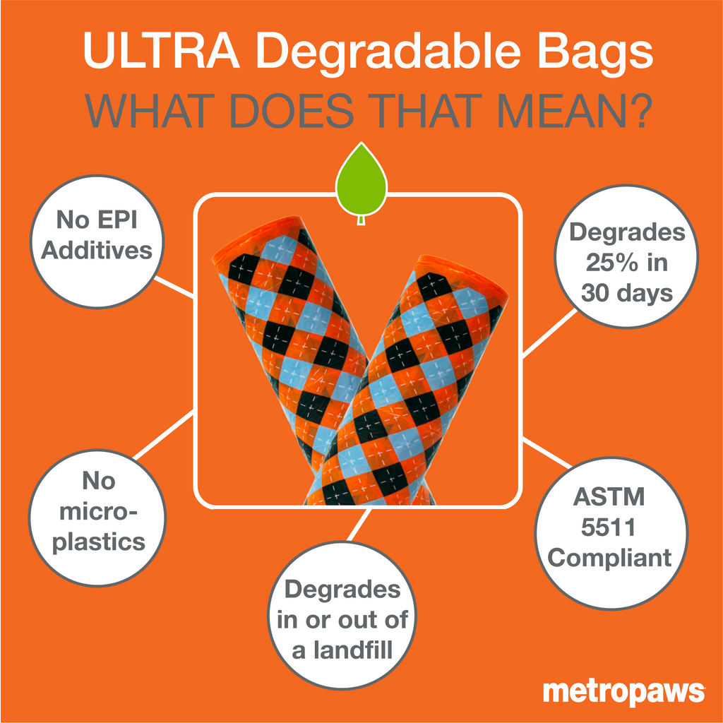Plastic seems to be everywhere and continues to overload our landfills. On average a single use plastic bag takes more than 1,000 years to break down. So what does that mean for your dog walks when you don’t want to add more plastic to our plant? Metro Paws ULTRA Degradable Poop Bags are the answer: durable and stylish bags that degrade up to 25% in just one month with an ASTM 5511 degradability rating. Enjoy your walks and feel confident knowing your poop bag will degrade in and out of a landfill…quickly.