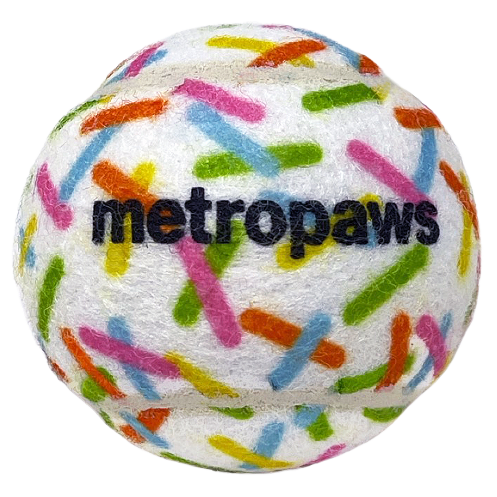 Front of Metro Pawty Box for Big Dogs, featuring sprinkles print, orange ribbon, and label