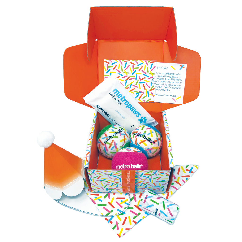 Pawty over here! Celebrate your pup with a ready-to-gift box that features Sprinkles-designed goodies and fun essentials that you and your pup will love! The Metro Paws Pawty Box makes the pawfect gift when you're celebrating their Birthday, Gotcha Day, or just because you want to spoil them. Available in two versions for Big and Lil pups.