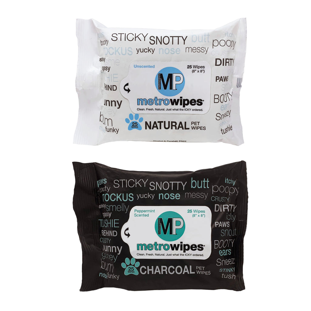 Our pet wipes are available in travel 25-count packages and bulk 100-count packages.