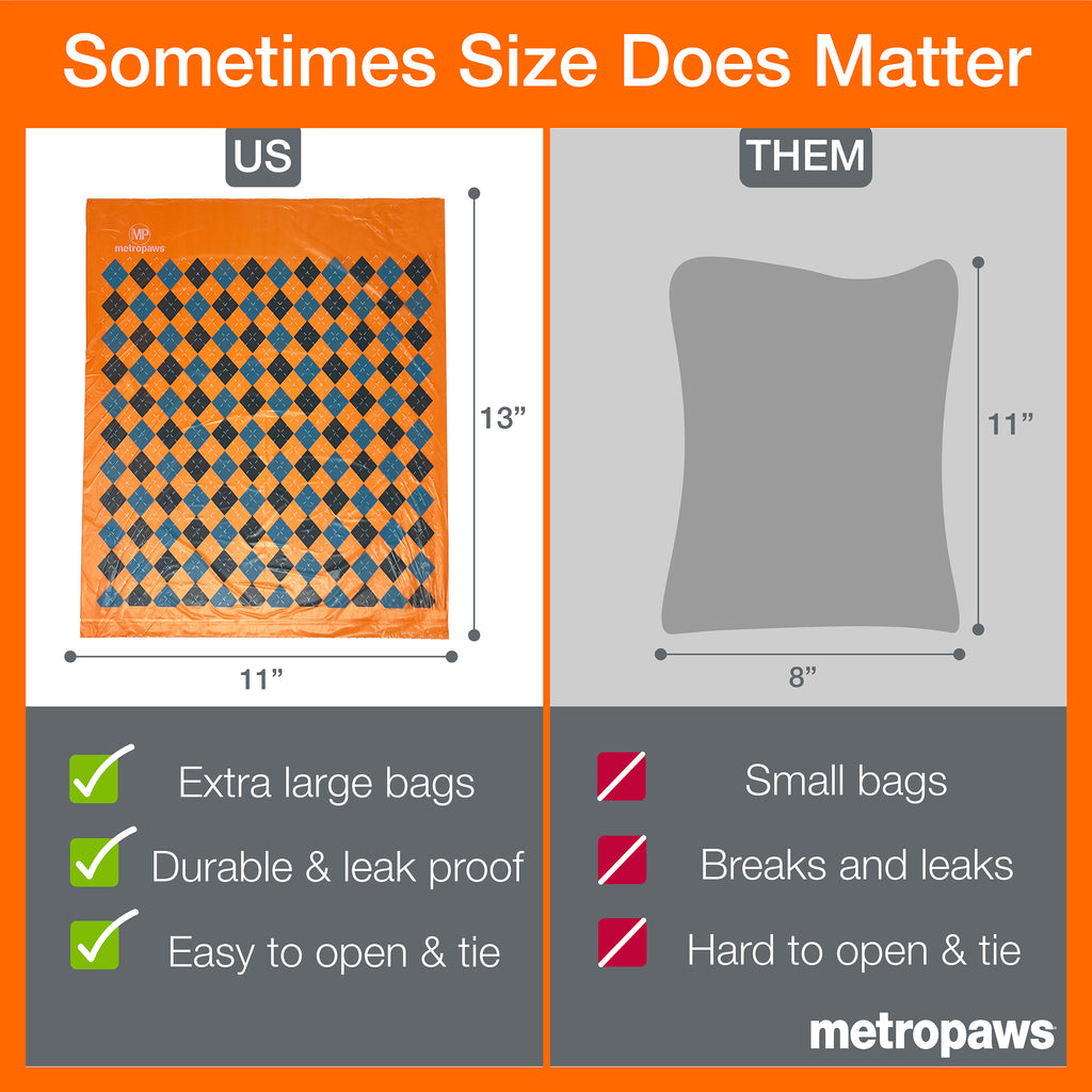 Poopy Packs XL™ are the LARGEST dog waste bags on the market. Because sometimes, size matters! These bags come in four chic and exclusive designs. They're designer, durable, and degradable.
